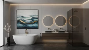Stilrent badrum med modern inredning, dekorerat med utvald konst.