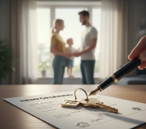 hemförsäkring ligger på bord och är påskriven, familj i bakgrund